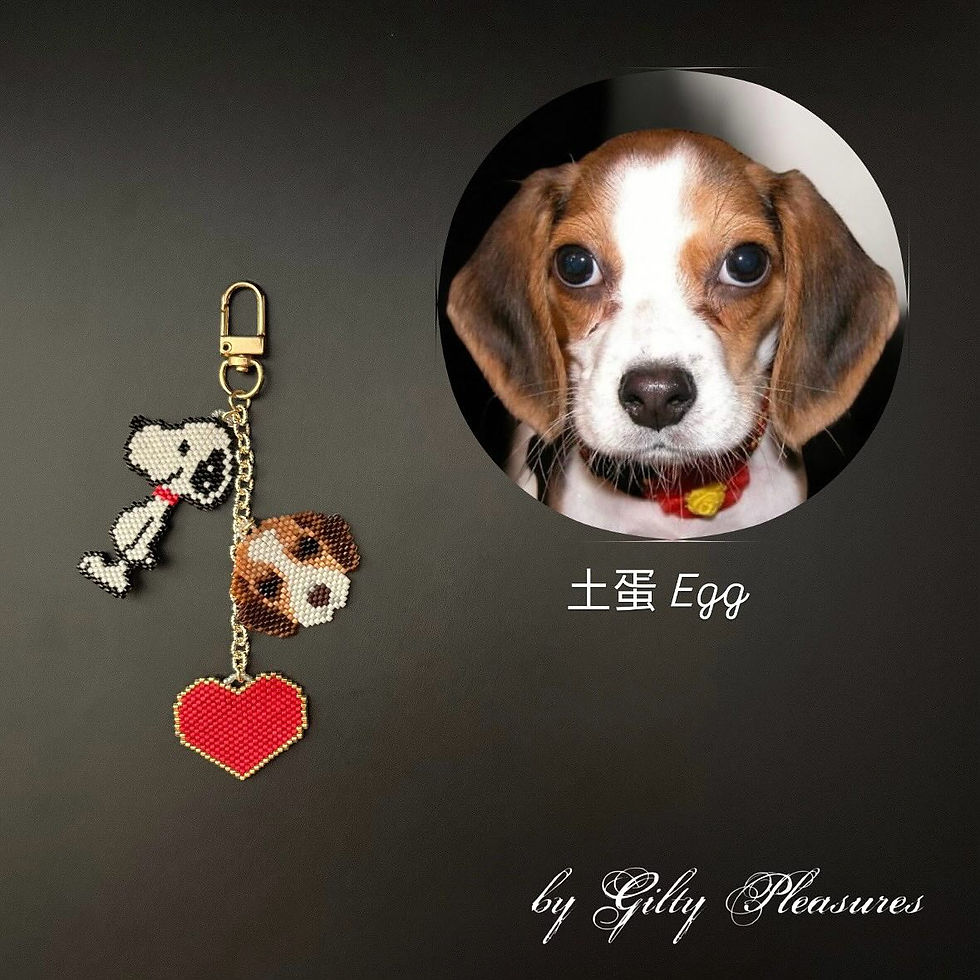 Keychain: a bespoke piece featuring pawtrait of Egg as well as Snoopy and heart-shaped charms. with 14K gold-plated main charm size ~3.8cm (W) x 3.2cm (H)