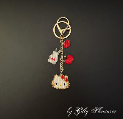 Keychain: an adorable piece featuring Hello Kitty, apple, milk carton & heart charms made with handwoven Japanese delica beads.